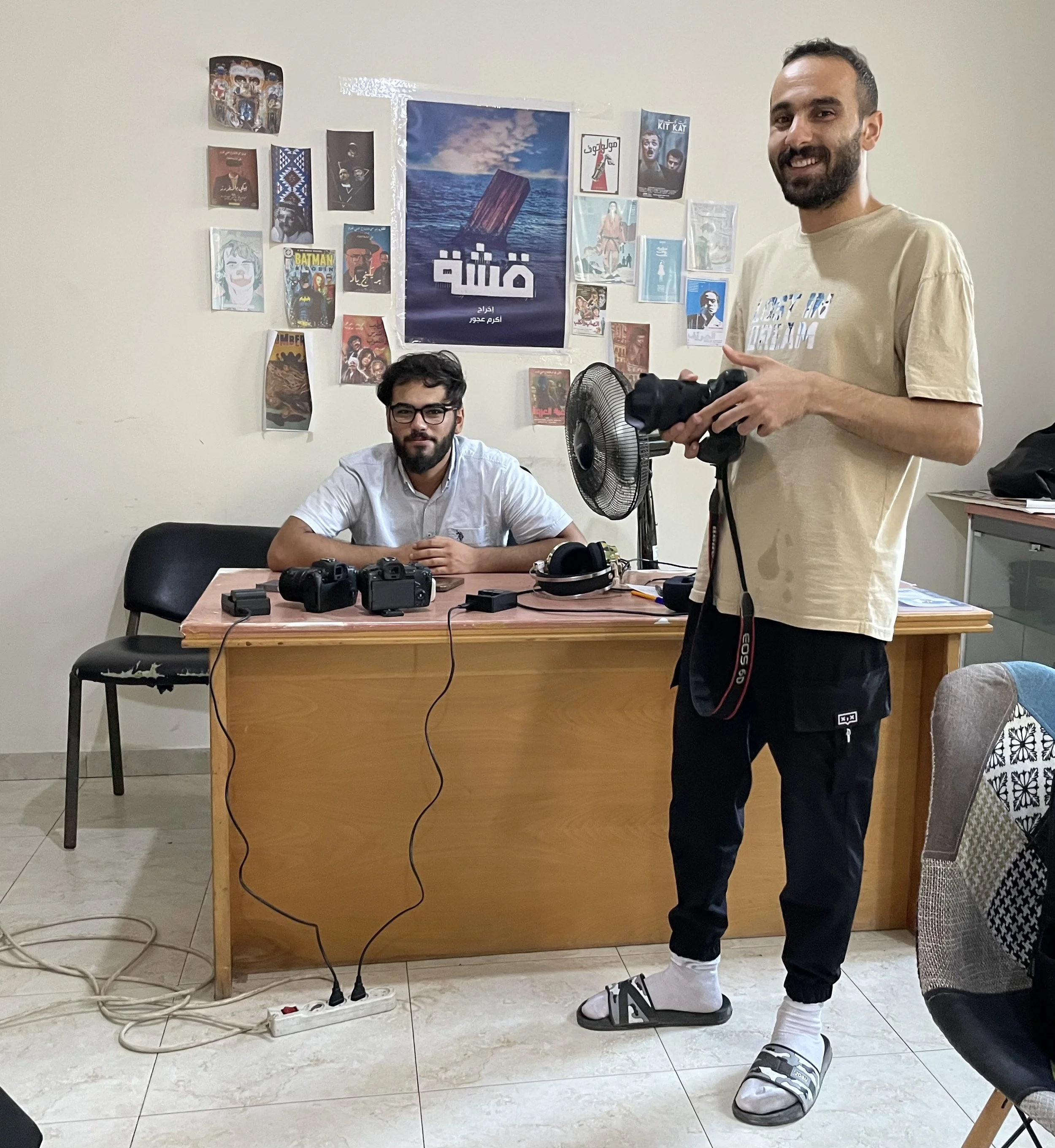 Hamdi bakom skrivbordet och Akram visar en kamera