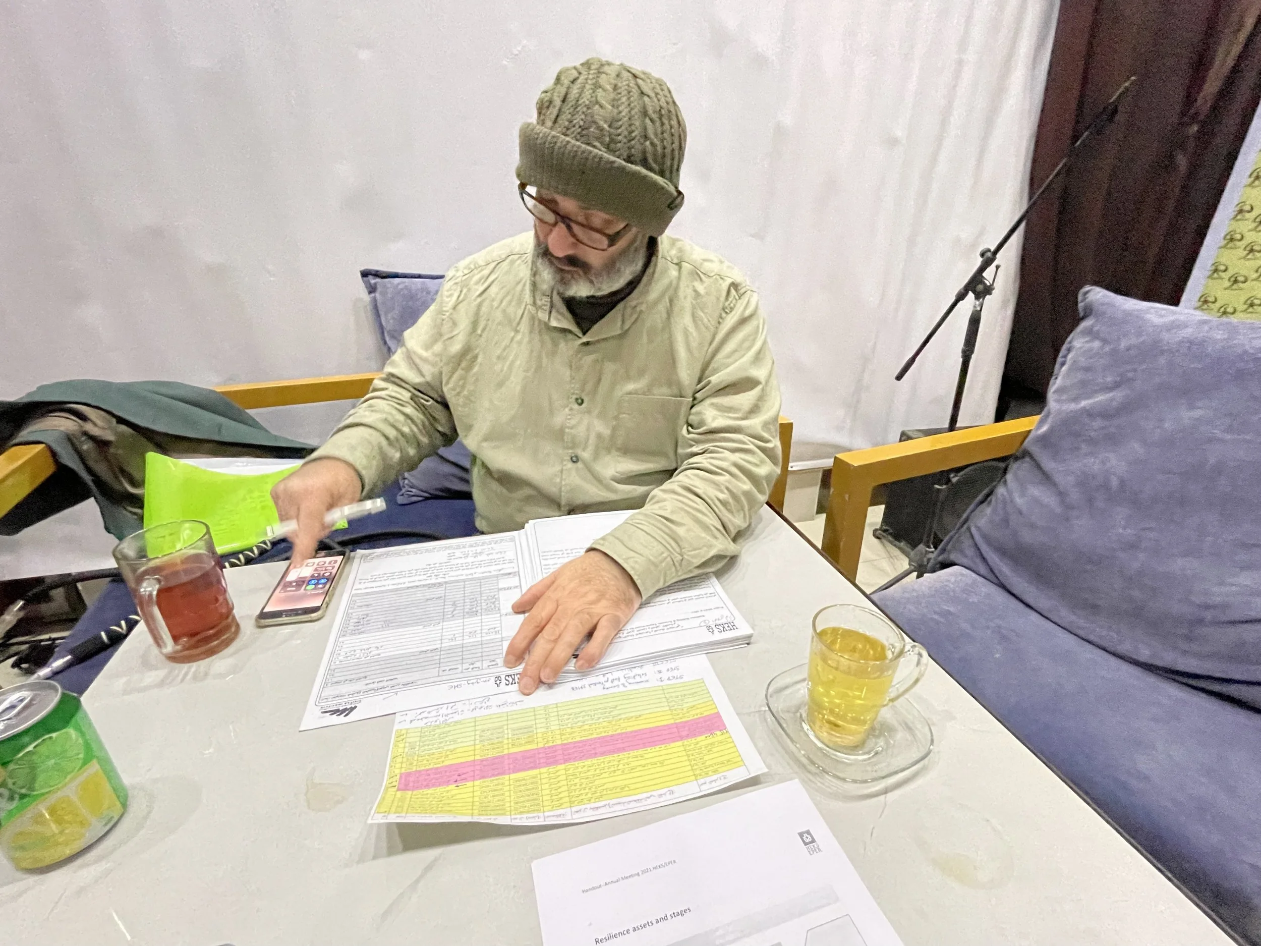 Maher arbetar med enkäten över företagare. I december är det kallt inomhus.