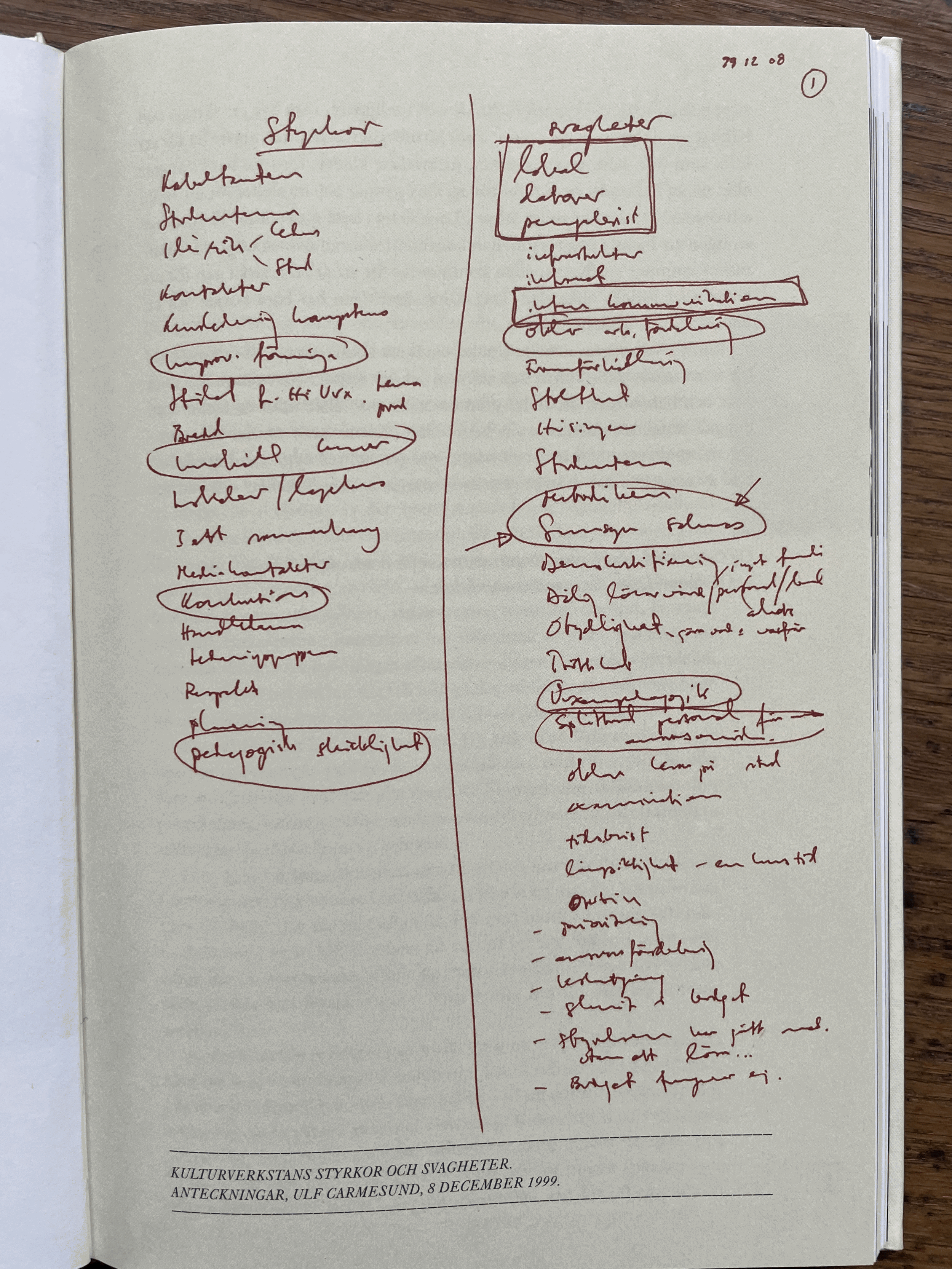 Jag var projektledare för Kulturverkstan åren 1999-2001 och var alltså med att starta utbildningen och tog emot den första årskullen studenter i augusti 1999. Det var spännande. En helt ny utbildning skulle ta form med kultur, IT och projektledning i fokus. Studenterna kom från många bakgrunder och hade erfarenhet från flera branscher även om kulturlivet dominerade. Det var ett intensivt arbete och det blev många anteckningar med styrkor och svagheter för att utveckla utbildningen (se bild nedan).